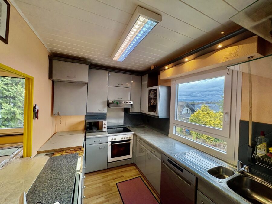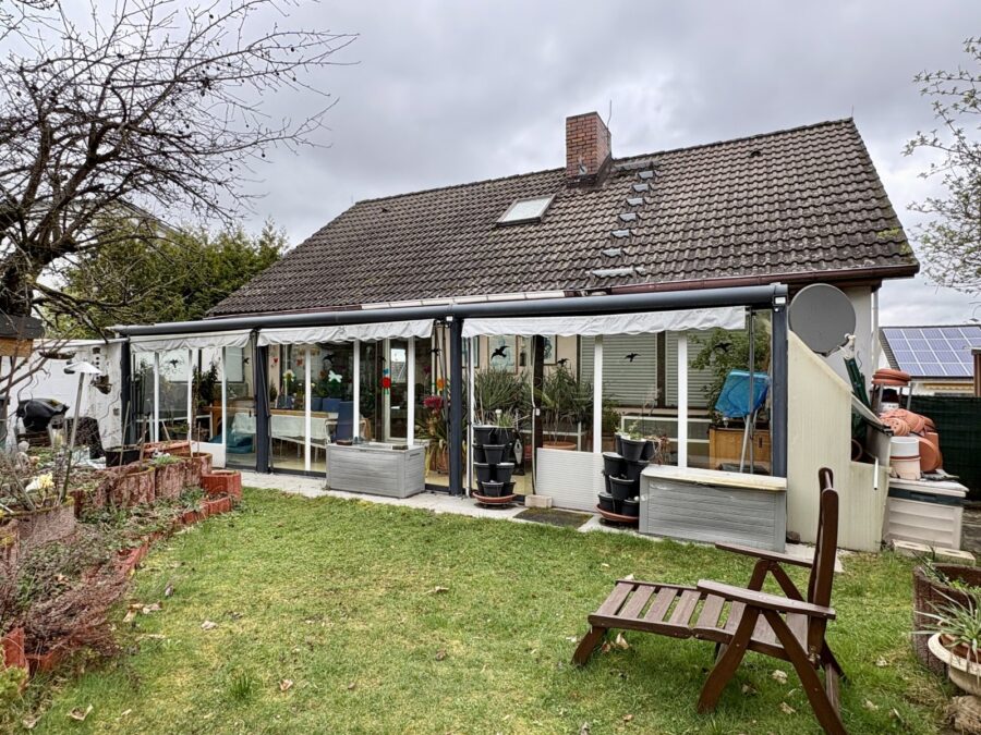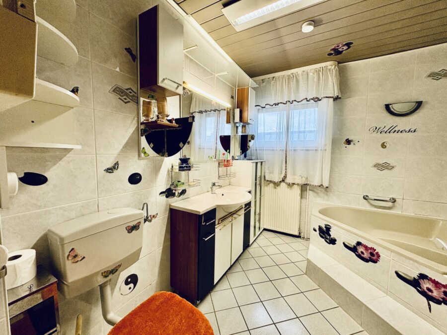 Sie betreten die Immobilie durch einen großzügigen Eingangsbereich im Erdgeschoss. Das Objekt ist aufgrund der Hanglage nicht zusätzlich unterkellert. Es besteht die Möglichkeit, im Erdgeschoss eine ca. 35 m² große Einliegerwohnung mit einem Zimmer, Bad und kleiner Küche abzuteilen. Die Nutzräume, bestehend aus einem Hauswirtschaftsraum und dem großen Heizungsraum mit viel Lagerfläche befinden sich ebenfalls im Erdgeschoss. Hier findet auch ein zusätzliches Gästezimmer seinen Platz. Über eine geschwungene Holztreppe erreichen Sie die Wohnebene im ersten Stock. Hier überrascht ein großes Wohn-/ Esszimmer mit Echtholz-Parkettboden und mit einem Kamin der mit einer Spartherm-Heizkassette ausgestattet ist. Die zum Wintergarten umgestaltete große Terrasse, die sich fast über die ganze Hauslänge erstreckt, bietet in Verbindung mit dem Wohnzimmer ganzjährig einen wunderbaren Blick in den großen Garten und die angrenzende Landschaft und verleiht den Räumen ein besonderes Flair. Im Garten befinden sich ein Pool mit Außendusche, eine Fass-Sauna und ein hübscher Gartenteich mit Koi-Karpfen. Ein großzügiges Schlafzimmer, ein Kinderzimmer und ein Tageslichtbad mit Eckbadewanne und Dusche sowie die Küche komplettieren diese Ebene. 2020 wurde das Dachgeschoss ausgebaut und dadurch 2 neue große Kinderzimmer geschaffen. Außerdem befindet sich dort ein zusätzliches WC und gut nutzbarer Stauraum in der Dachschräge. Insgesamt befindet sich das 1973, als Fertighaus, erbaute Objekt in einem guten Zustand. In der Vergangenheit wurde bereits 1999 die Heizung ausgetauscht. Außerdem wurde das Familienbad erneuert und der Wintergarten errichtet.