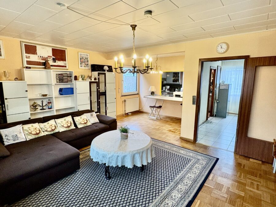 1 Wohn-Esszimmer mit Kamin und Parkettboden
